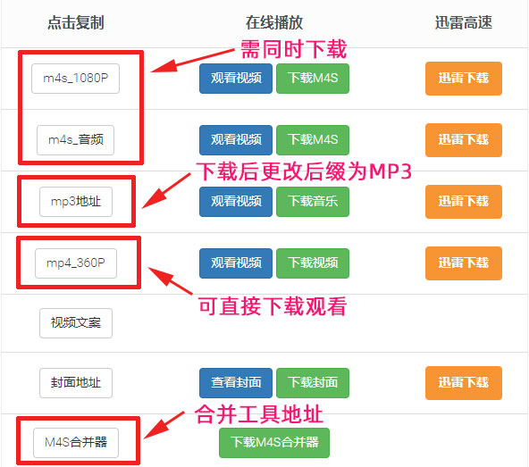 步骤5 : 可以直接下载音频MP3,或者无需合并的360P视频, 如果需要下载高清视频,请将页面中的M4S视频以及音频保存到同一目录,然后使用 B站M4S视频音频合并工具 即可无损合并为MP4。
